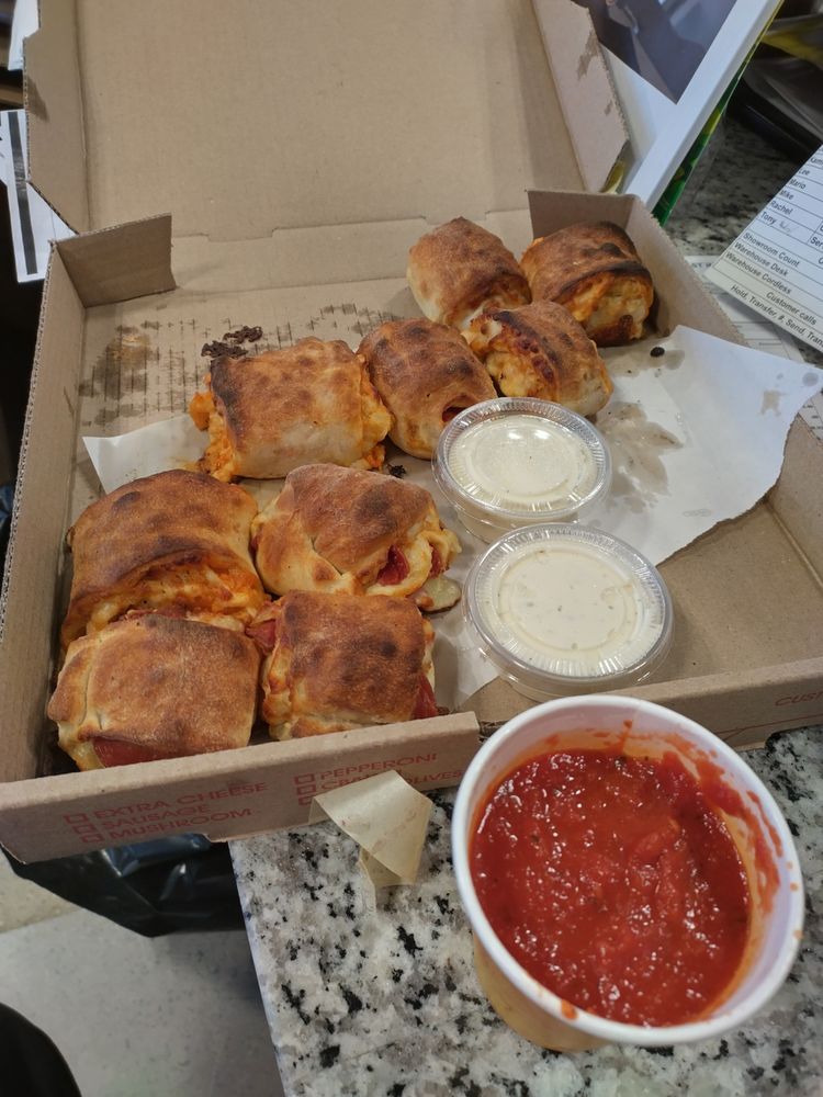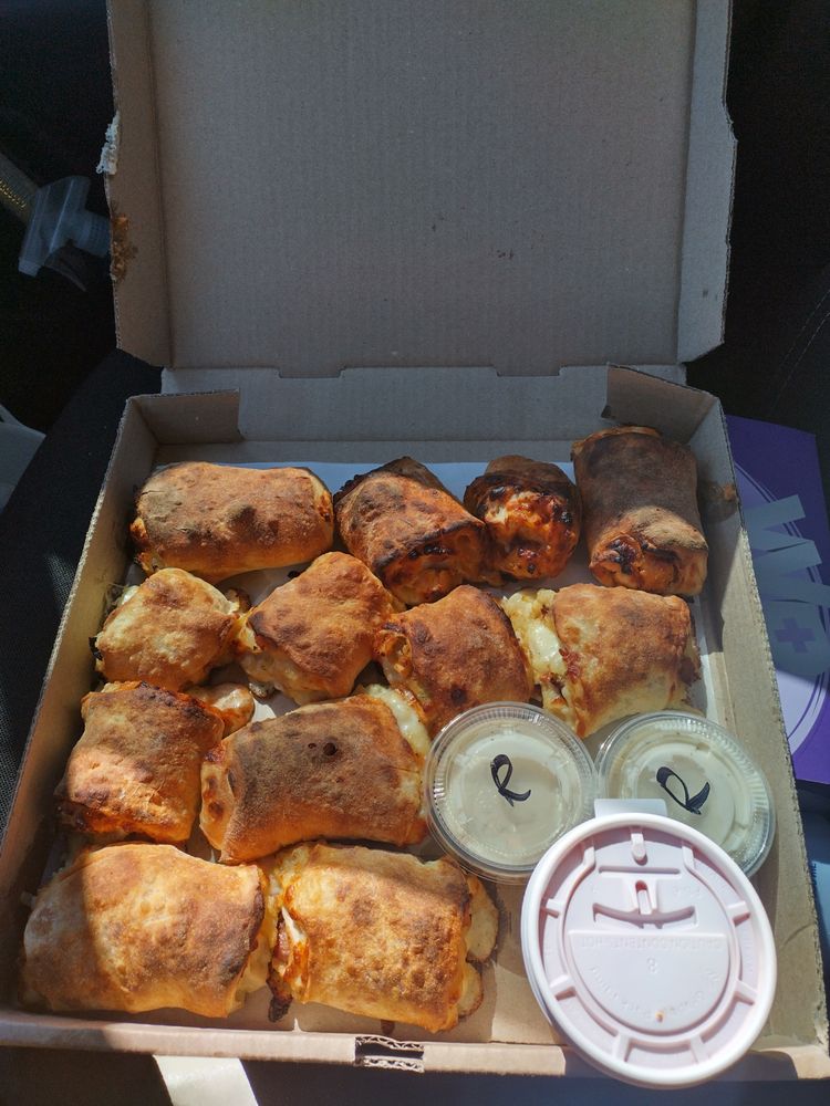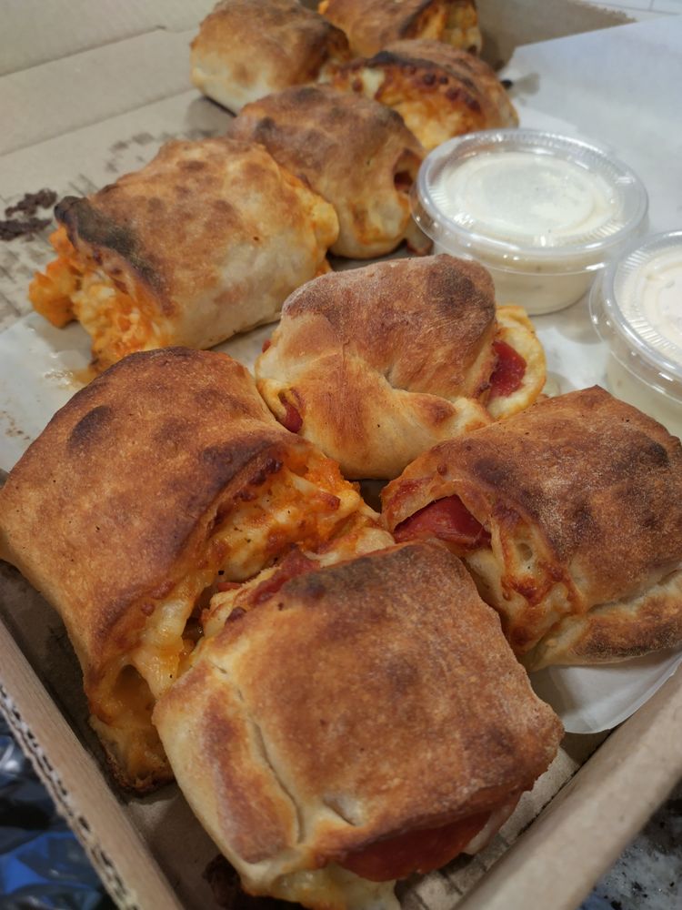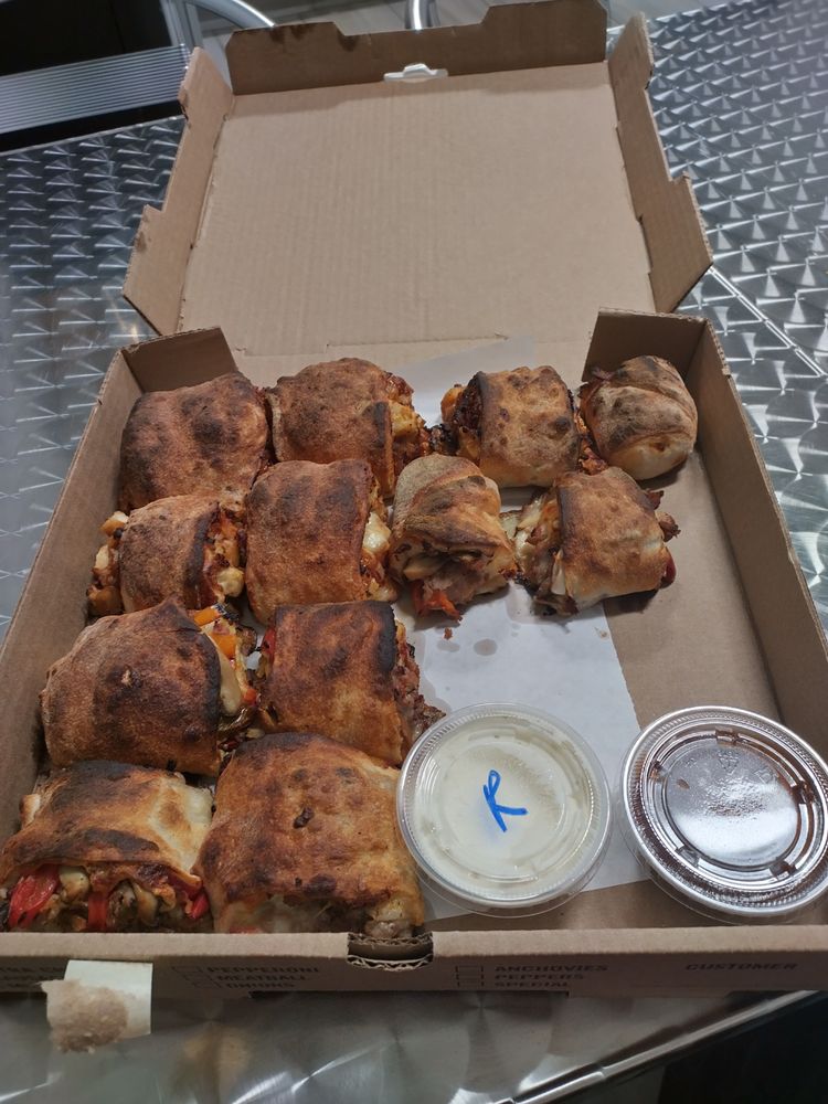 Buffalo Chicken, Mozzarella Cheese made into Pizza Rolls. 11-14 pieces per order. Includes either two Blue or two Ranch dressings. Please specify on dressings