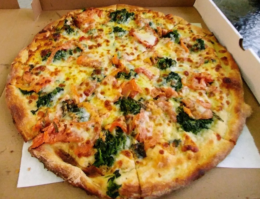 Spinach, Broccoli, Peppers, Mushrooms, Fresh Tomato, Olive, Onion and Cheese.