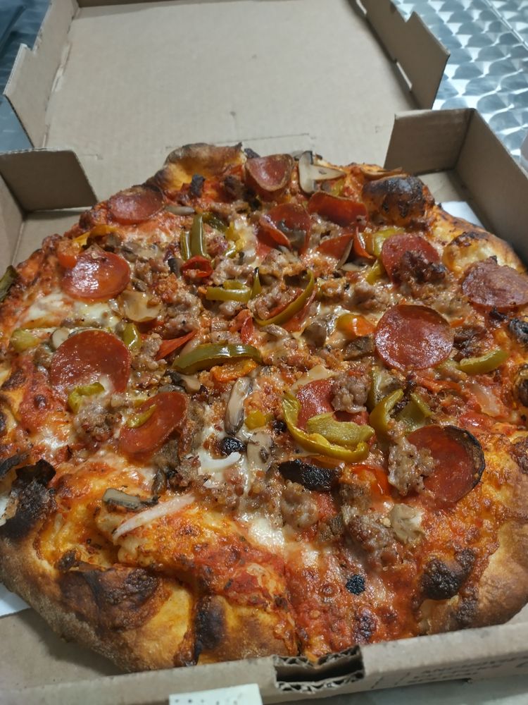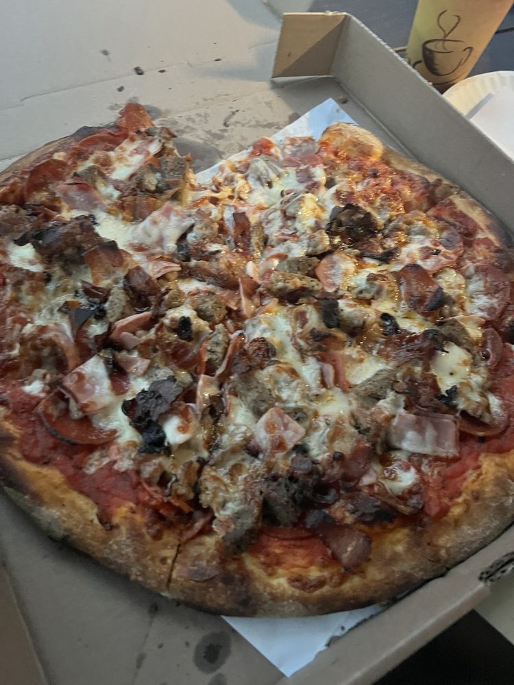 Pepperoni, sausage, bacon, mushrooms, onion, peppers, anchovies, meatball and olives