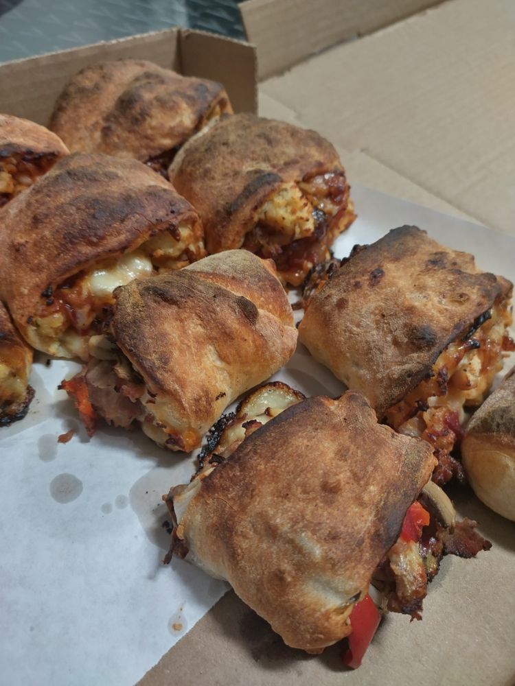 Specialty Pizza Roll. Comes with sides of extra Barbeque Sauce or Ranch or Blue Cheese Dressing, please indicate.